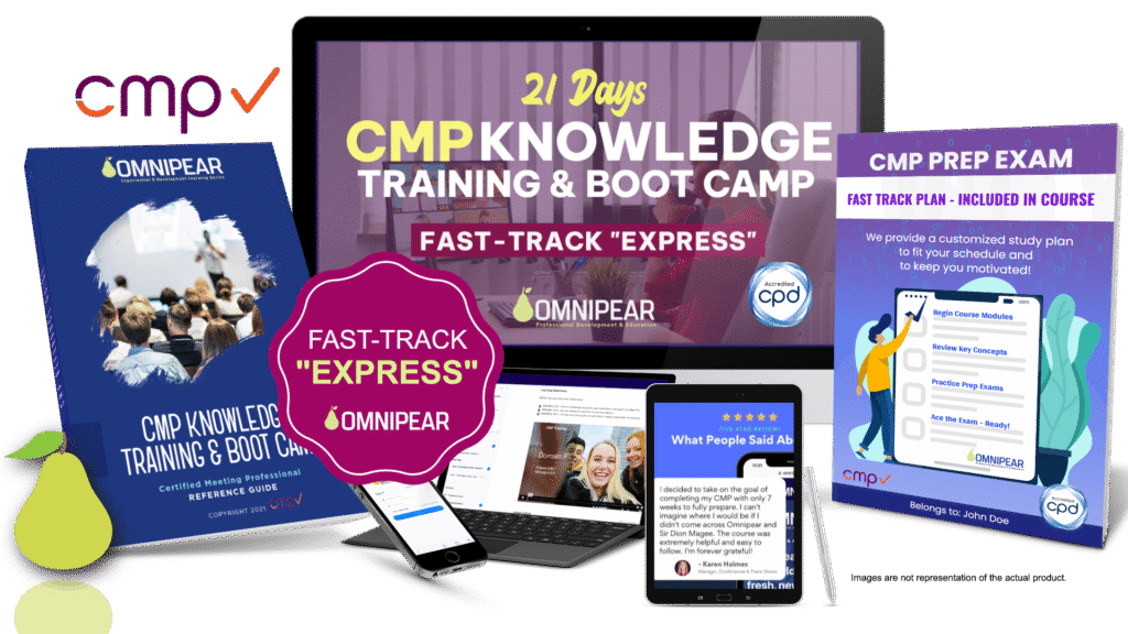 CMP Knowledge Training & Boot Camp offers a convenient pathway to attaining your CMP certification. OmniPear is a preferred supplier of the Events Industry Council (EIC)*. Developed by a team of recent CMP exam graduates, a success map, training and supplementary materials are provided to help you master the CMP international standards. Instructors hold certifications as Certified Meeting Professionals, Certified Project Management Professionals and other industry credentials. By taking this course, time and money can be saved while earning all 25 CEUs required for certification or re-certification.